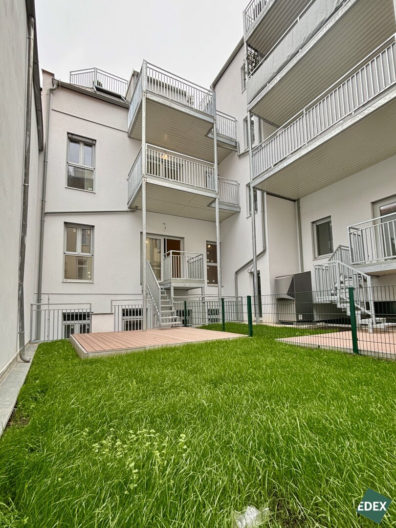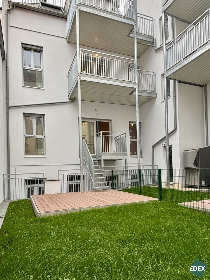 Diese wunderschöne, ca. 106 m² große 4-Zimmer-Wohnung befindet sich im 1.Liftstock im Altbau des Gebäudes. Die Wohnung besticht durch einen zentralen Vorraum, ein großzügiges Wohnzimmer mit Anschlüssen für eine offene Küche, drei Schlafzimmer, einen Abstellraum mit Waschmaschinenanschluss, ein Badezimmer mit Dusche, Badewanne, WC und Doppelwaschbecken sowie ein separates WC. Das Highlight ist die rund 14 m² große südlich ausgerichtete Terrasse mit anschließender rund 25 m² großer Grünfläche, die über eine Treppe von der Wohnküche aus zugänglich ist und ausreichend Platz für die persönliche Grünoase bietet.