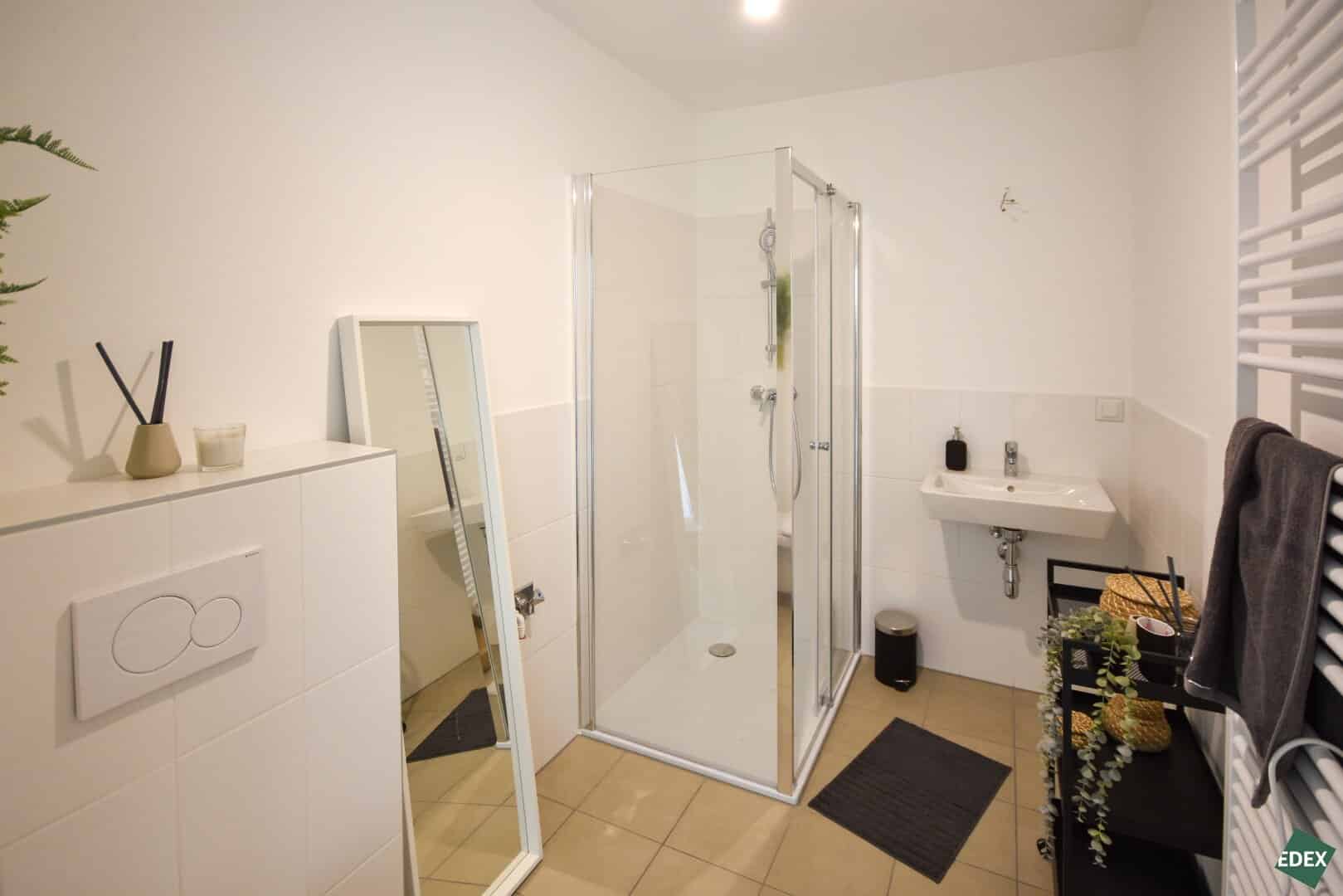 Alle 44 Eigentumswohnungen verfügen über äußerst effiziente Grundrisse sowie teilweise über Balkon, Terrasse oder Eigengarten, die Nutzflächen der Wohnungen liegen zwischen 32 m² und 91 m². Moderne, elegante Bäder und hochwertige Parkettböden schaffen eine zeitgemäße Wohnatmosphäre. Eine Wärmepumpe sowie eine Photovoltaik-Anlage mit einer Leistung von mindestens ca. 3,46 kWp sorgen für eine umweltschonende Energieversorgung. Durch Einsatz eines Smart-Home-Systems, können Haustüren über das Smartphone aufgesperrt oder Informationen zum Gebäude von unterwegs abgerufen werden. In der Garage stehen 21 Garagenplätze zur Verfügung, E-Ladestationen können nachgerüstet werden.