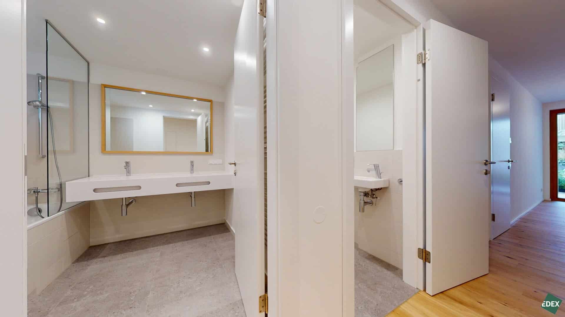 Separate Toiletten mit Handwaschbecken, stilvolle Bäder mit Badewanne, Handtuchheizkörper und Spiegel bieten Komfort mit durchdachtem Design. Der Waschmaschinenanschluss – je nach Wohnung im Bad oder Abstellraum – sorgt für maximale Alltagstauglichkeit.