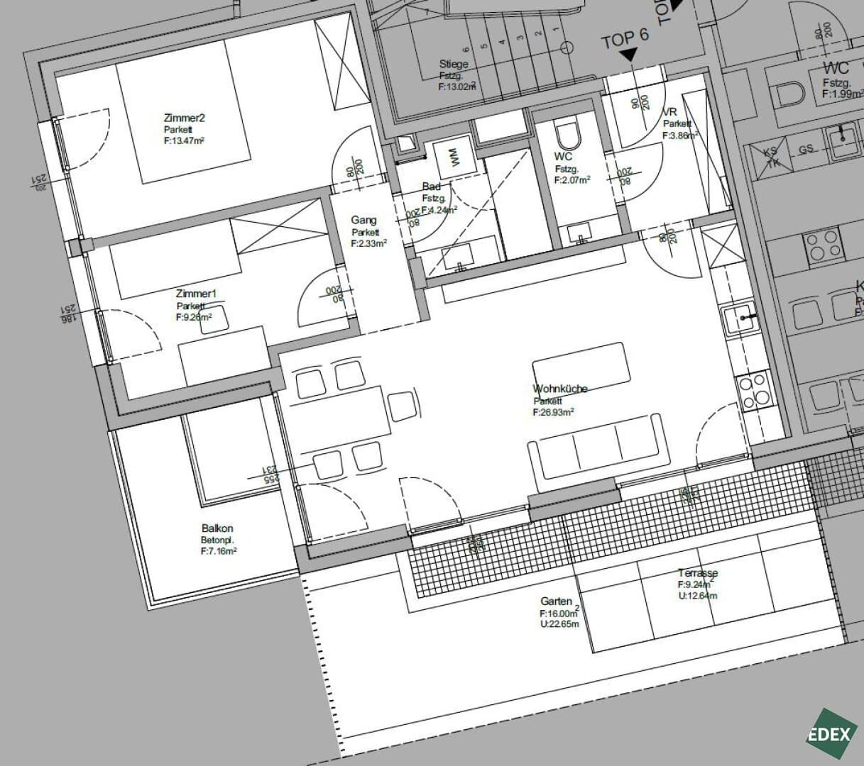 Die Wohnungen mit einer Größe von ca. 48 m² bis 137 m² verfügen über ein bis drei Zimmer und bieten großzügige Grundrisse mit durchdachter Raumaufteilung. Beinahe jede Einheit verfügt über eine Freifläche in Form von Balkon, Terrasse oder Garten – für mehr Licht, Luft und Lebensqualität. Die intelligente Raumnutzung vermittelt selbst bei kleineren Flächen Großzügigkeit. Der zentrale Wohnbereich mit offener Küche (ausgestattet mit modernen SIEMENS-Geräten) schafft einen harmonischen Mittelpunkt für entspanntes Wohnen.