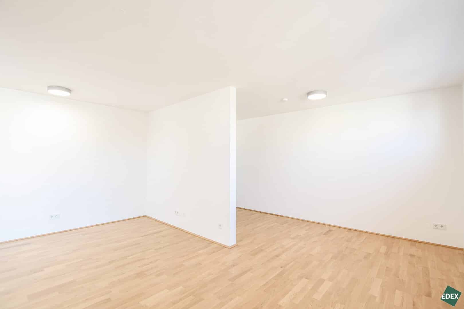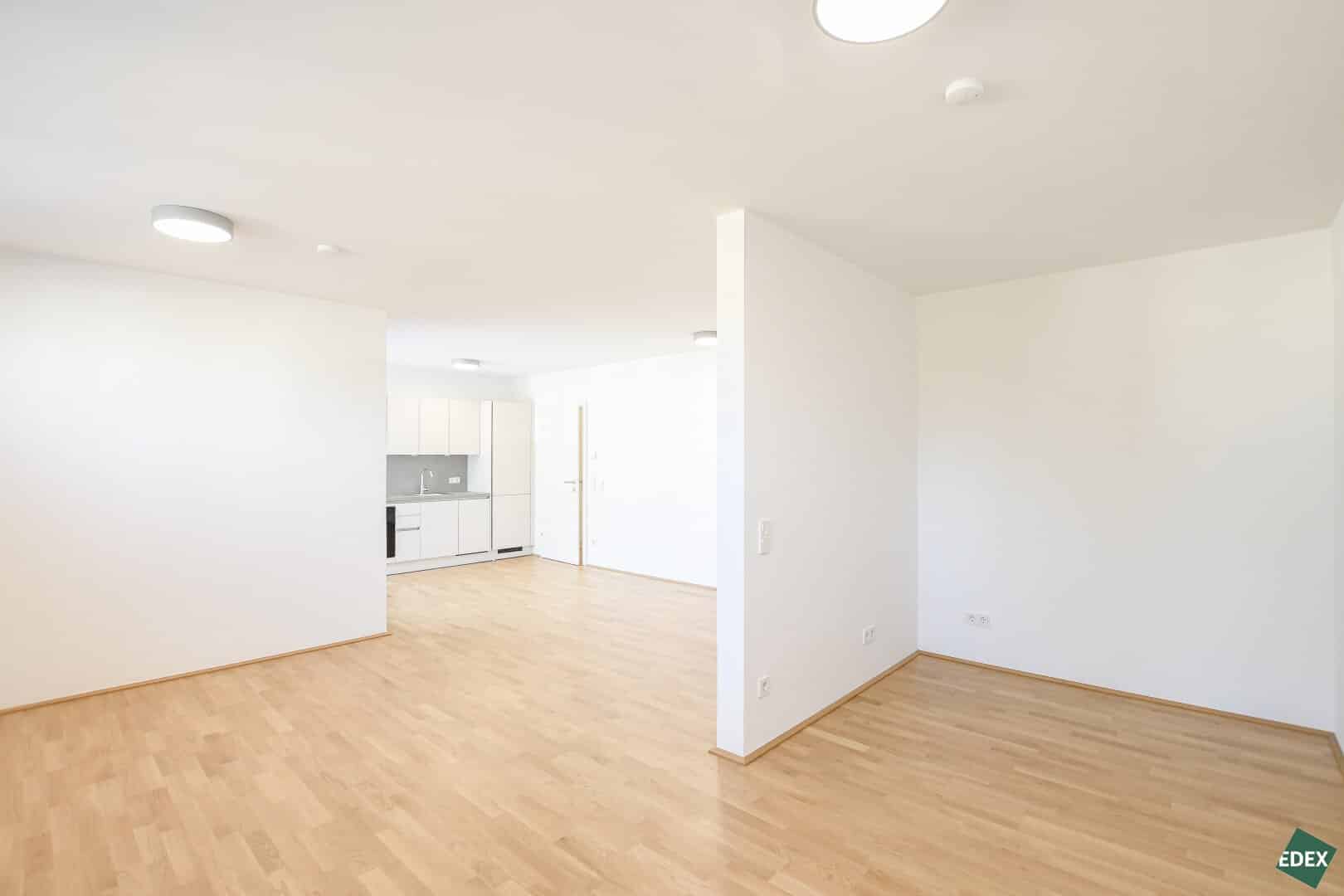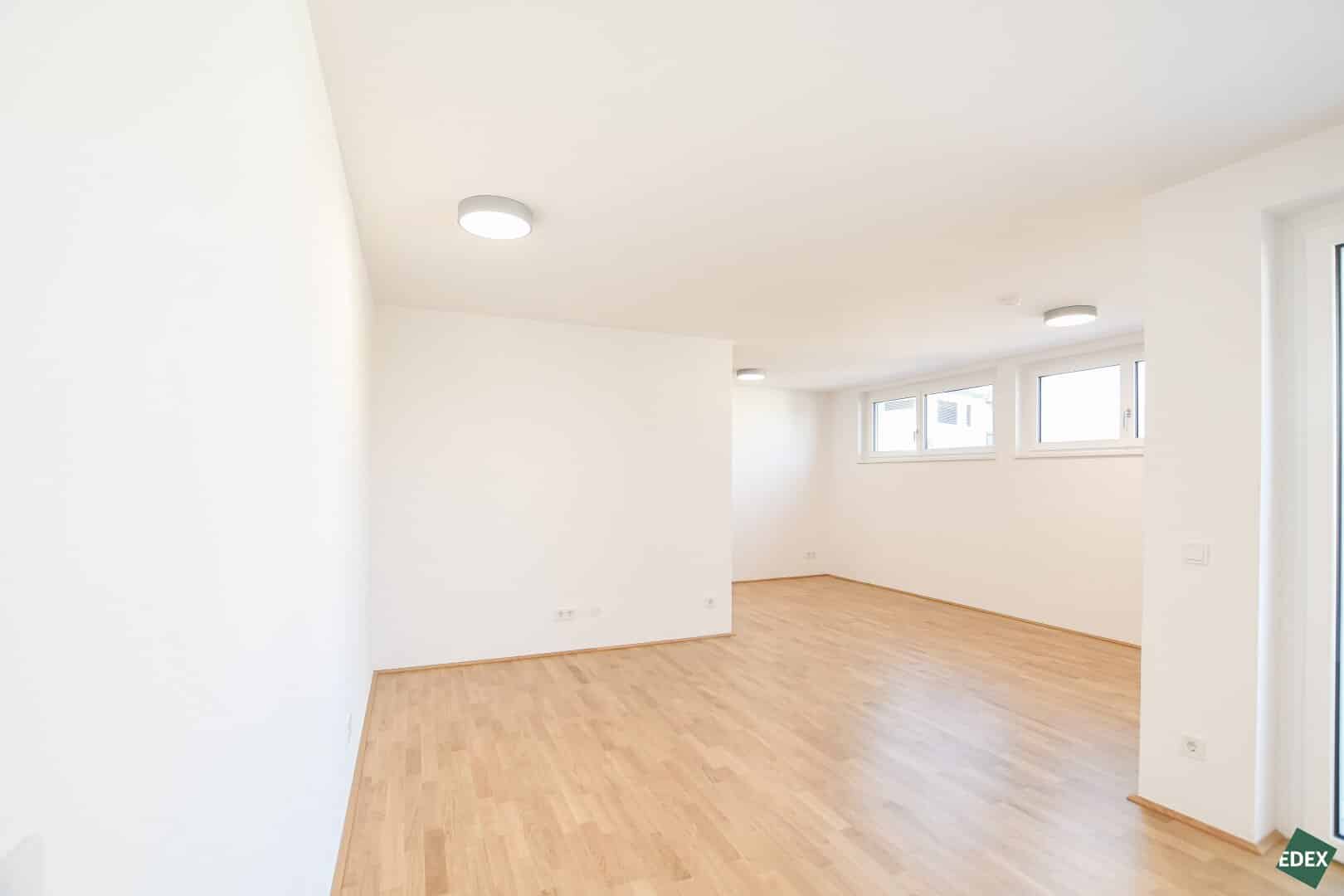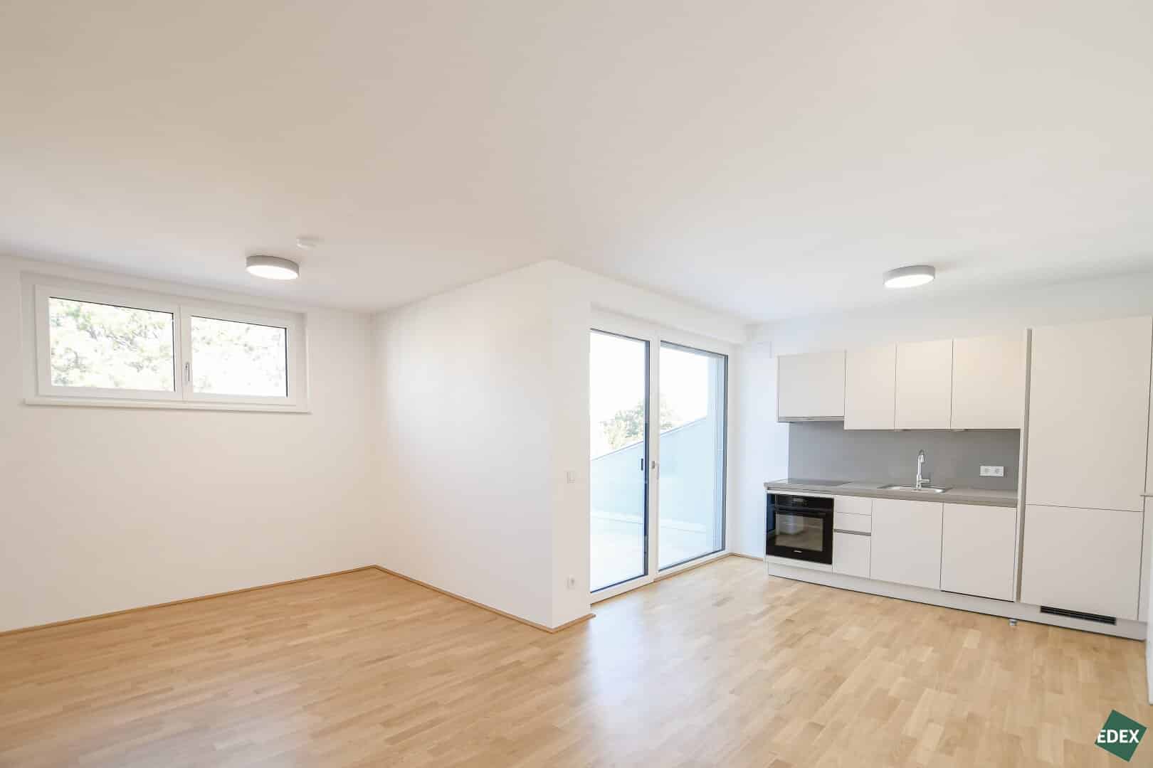 Die Wohnungen mit einer Größe von ca. 48 m² bis 137 m² verfügen über ein bis drei Zimmer und bieten großzügige Grundrisse mit durchdachter Raumaufteilung. Beinahe jede Einheit verfügt über eine Freifläche in Form von Balkon, Terrasse oder Garten – für mehr Licht, Luft und Lebensqualität. Die intelligente Raumnutzung vermittelt selbst bei kleineren Flächen Großzügigkeit. Der zentrale Wohnbereich mit offener Küche (ausgestattet mit modernen SIEMENS-Geräten) schafft einen harmonischen Mittelpunkt für entspanntes Wohnen.