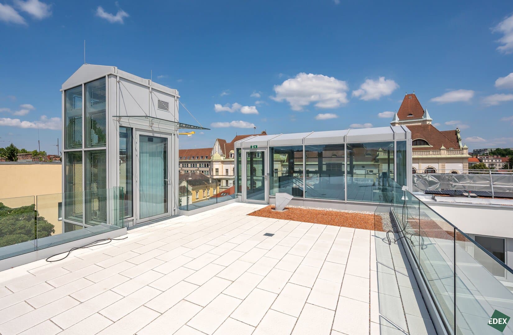 Die Büroeinheiten sind sowohl über die Einkaufspassage im Erdgeschoß am Hauptplatz des EKAZENT als auch über die hauseigene Tiefgarage zugänglich. Von dort aus führen ein Personenaufzug und ein Stiegenhaus in die oberen Stockwerke. Auch die Dachterrasse im 4. Stock ist bequem mit dem Lift erreichbar.
