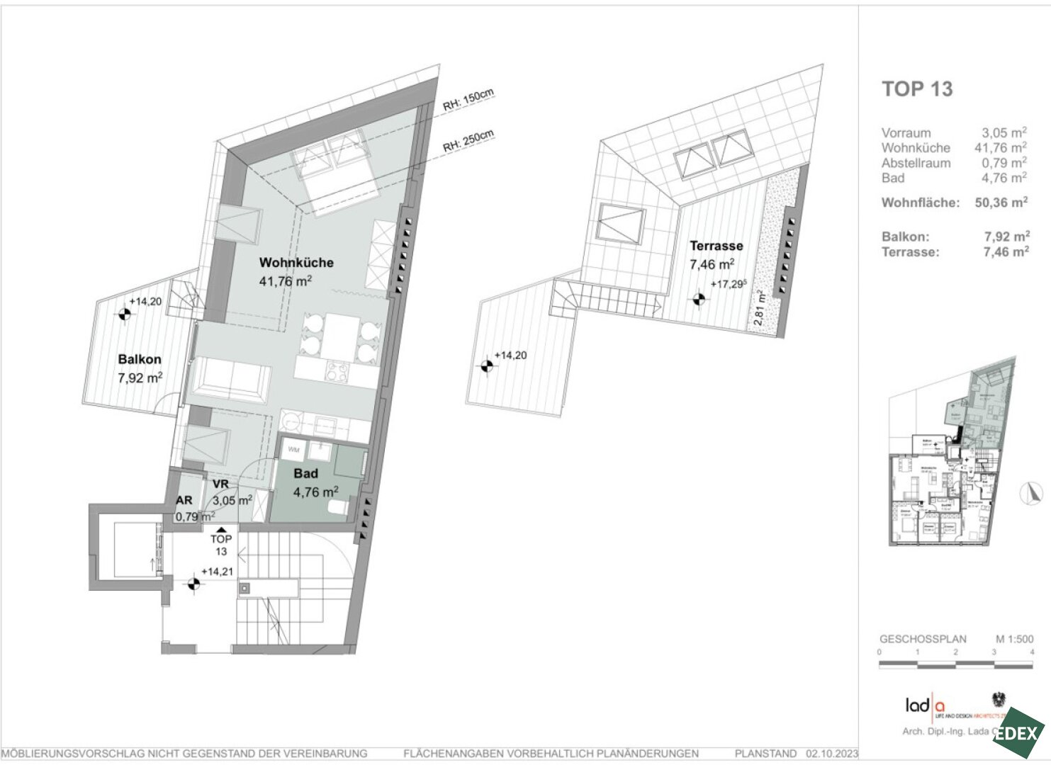 - TOP 14a: ca. 44,33 m² große 2-Zimmerwohnung mit ca. 19,42 m² Terrasse: EUR 398.000,-