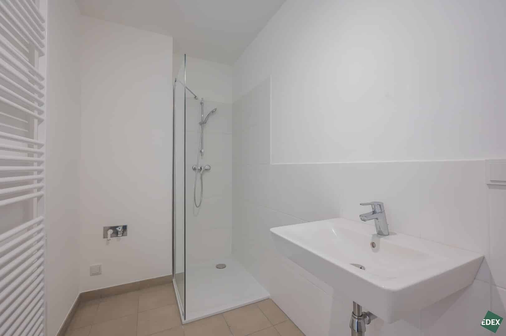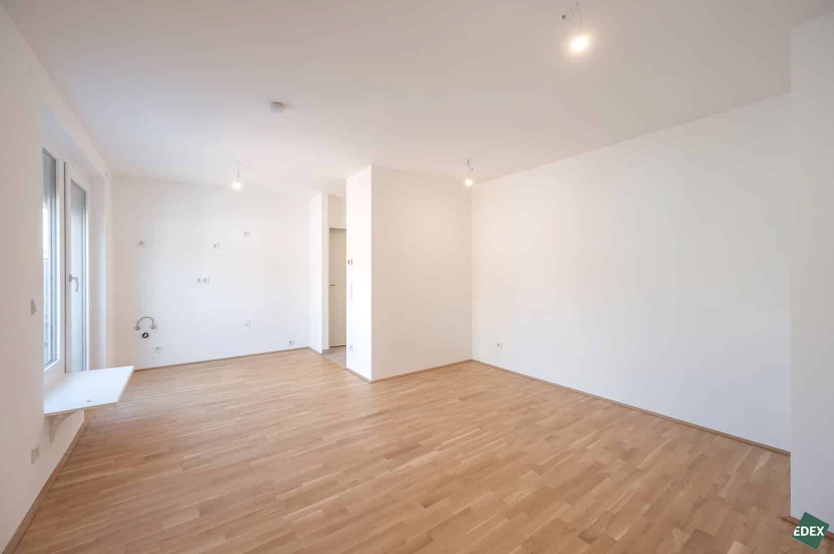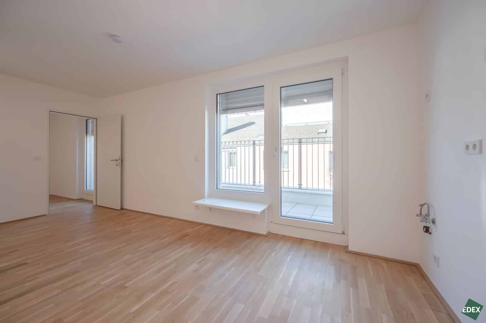 Diese 2 Zimmer-Wohnung im 4. Stock mit ca. 37,94 m² verfügt über einen Wohnraum mit Anschlüssen für eine Wohnküche, einen Schlafraum, ein Bad mit Dusche, WC und Waschmaschinenanschluss sowie einen Vorraum. Highlight der Wohnung ist die ca. 13,51 m² große Terrasse, die von beiden Räumen begehbar ist.
