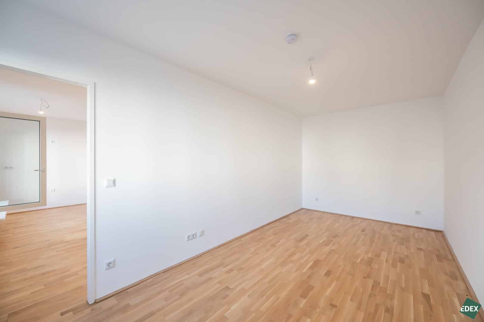 Alle 44 Eigentumswohnungen verfügen über äußerst effiziente Grundrisse sowie teilweise über Balkon, Terrasse oder Eigengarten, die Nutzflächen der Wohnungen liegen zwischen 32 m² und 91 m². Moderne, elegante Bäder und hochwertige Parkettböden schaffen eine zeitgemäße Wohnatmosphäre. Eine Wärmepumpe sowie eine Photovoltaik-Anlage mit einer Leistung von mindestens ca. 3,46 kWp sorgen für eine umweltschonende Energieversorgung. Durch Einsatz eines Smart-Home-Systems, können Haustüren über das Smartphone aufgesperrt oder Informationen zum Gebäude von unterwegs abgerufen werden. In der Garage stehen 21 Garagenplätze zur Verfügung, E-Ladestationen können nachgerüstet werden.