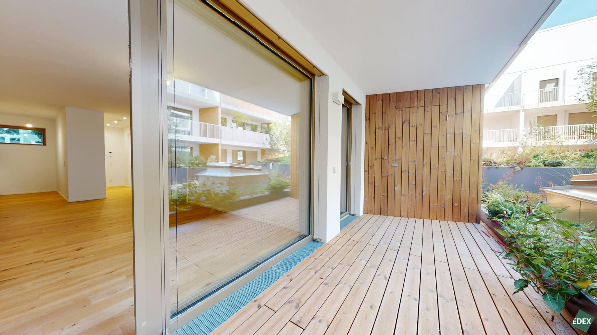 Auf den großzügigen Freiflächen schaffen bereits integrierte Pflanzentröge und Wasseranschlüsse Raum für Ihr eigenes kleines Grün im Innenhof – ideal zum Abschalten nach einem langen Tag.