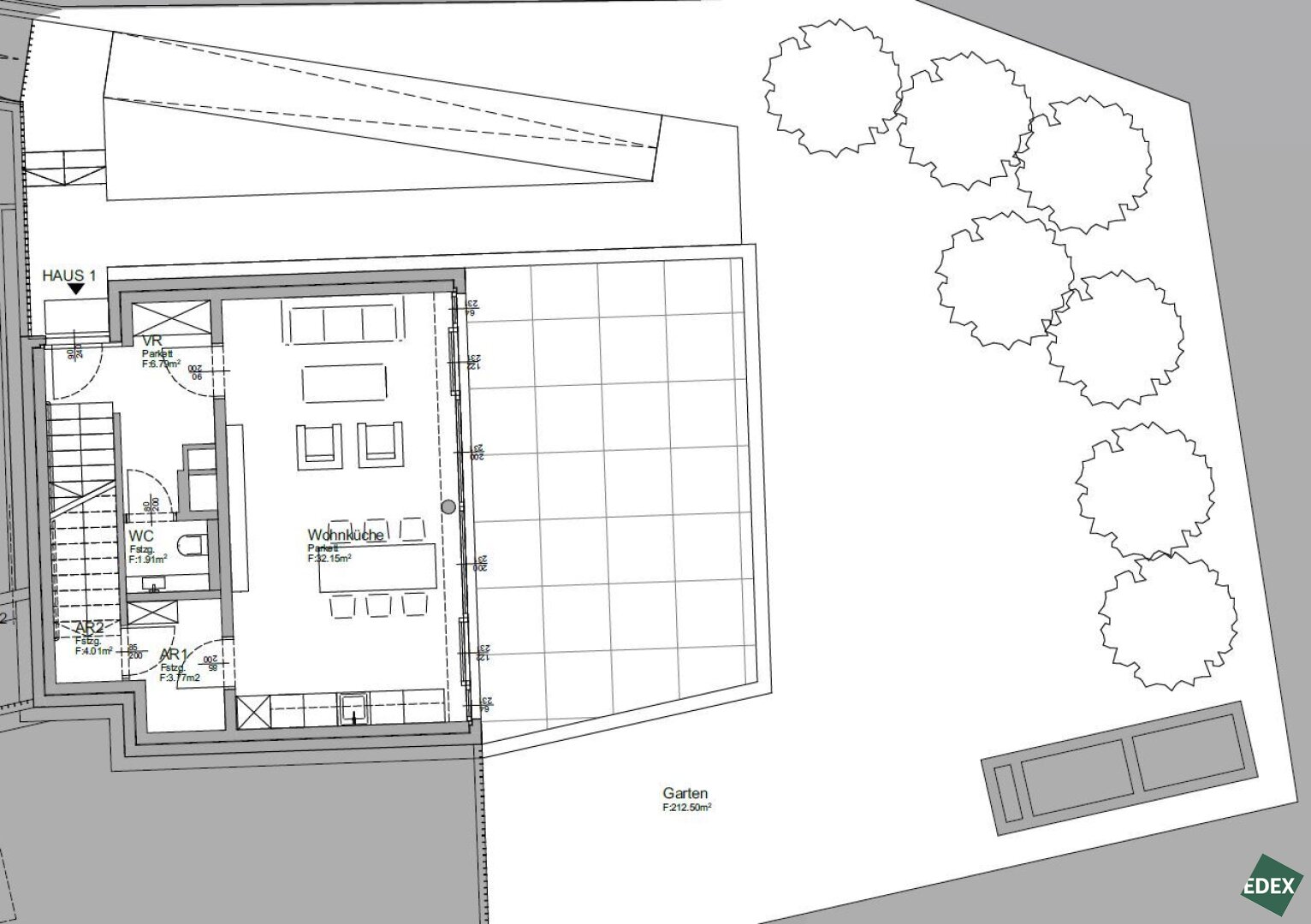 Im Erdgeschoss befindet sich der offen gestaltete Wohnbereich mit moderner Einbauküche. Von hier aus gelangt man direkt auf die weitläufige Terrasse und in den großen Garten. Ebenfalls auf dieser Ebene liegen ein Vorraum sowie praktische Abstellräume.