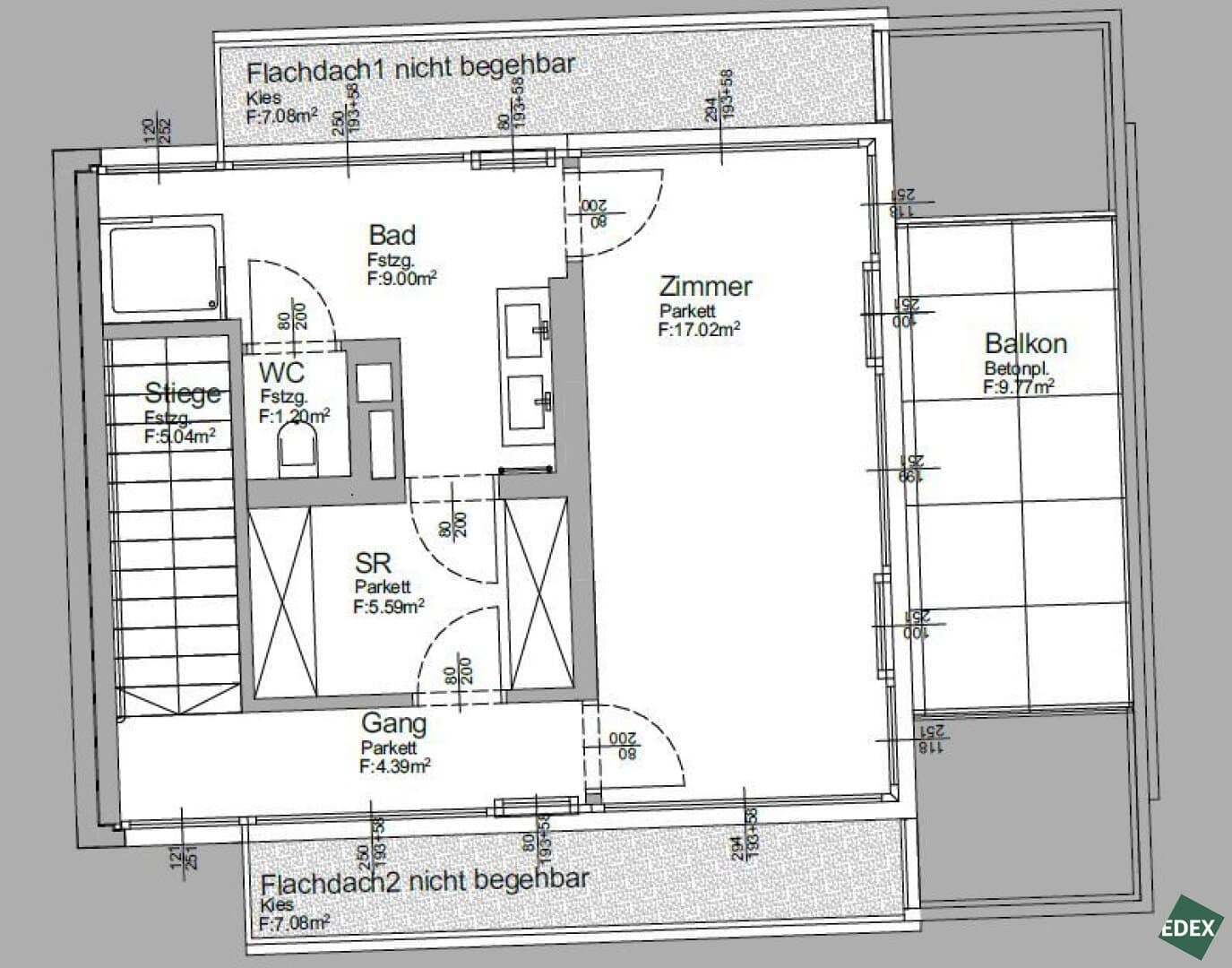 Im Dachgeschoss befindet sich ein weiterer großzügiger Wohn- bzw. Schlafraum, ein großes Badezimmer, ein separates WC, ein zusätzlicher Stauraum sowie ein weiterer Balkon. Die angrenzenden Flachdachbereiche sind nicht begehbar.