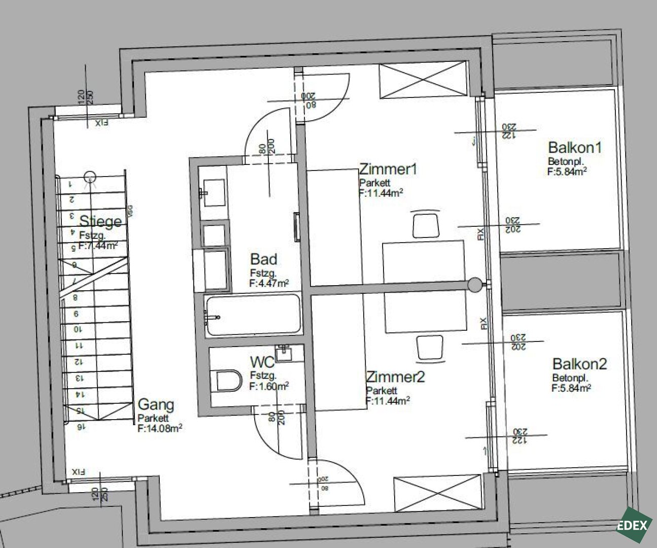 Das Obergeschoss beherbergt zwei nahezu gleich große Schlafzimmer, ein Badezimmer sowie zwei Balkone, die von beiden Zimmern aus begehbar sind. Der zentrale Gang verbindet alle Räume dieser Ebene.
