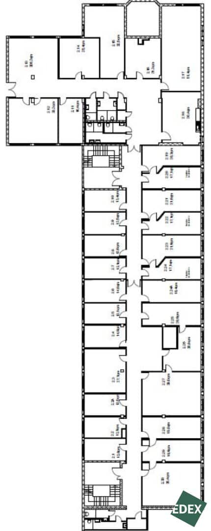 Die Büroflächen liegen teilweise übereinander, verfügen über mehrere Stiegenhäuser und sind direkt miteinander verbunden. Die Raumhöhe in den Büroräumen beträgt drei Meter. In den Gängen ist die Raumhöhe durch eine abgehängte Decke etwas niedriger.