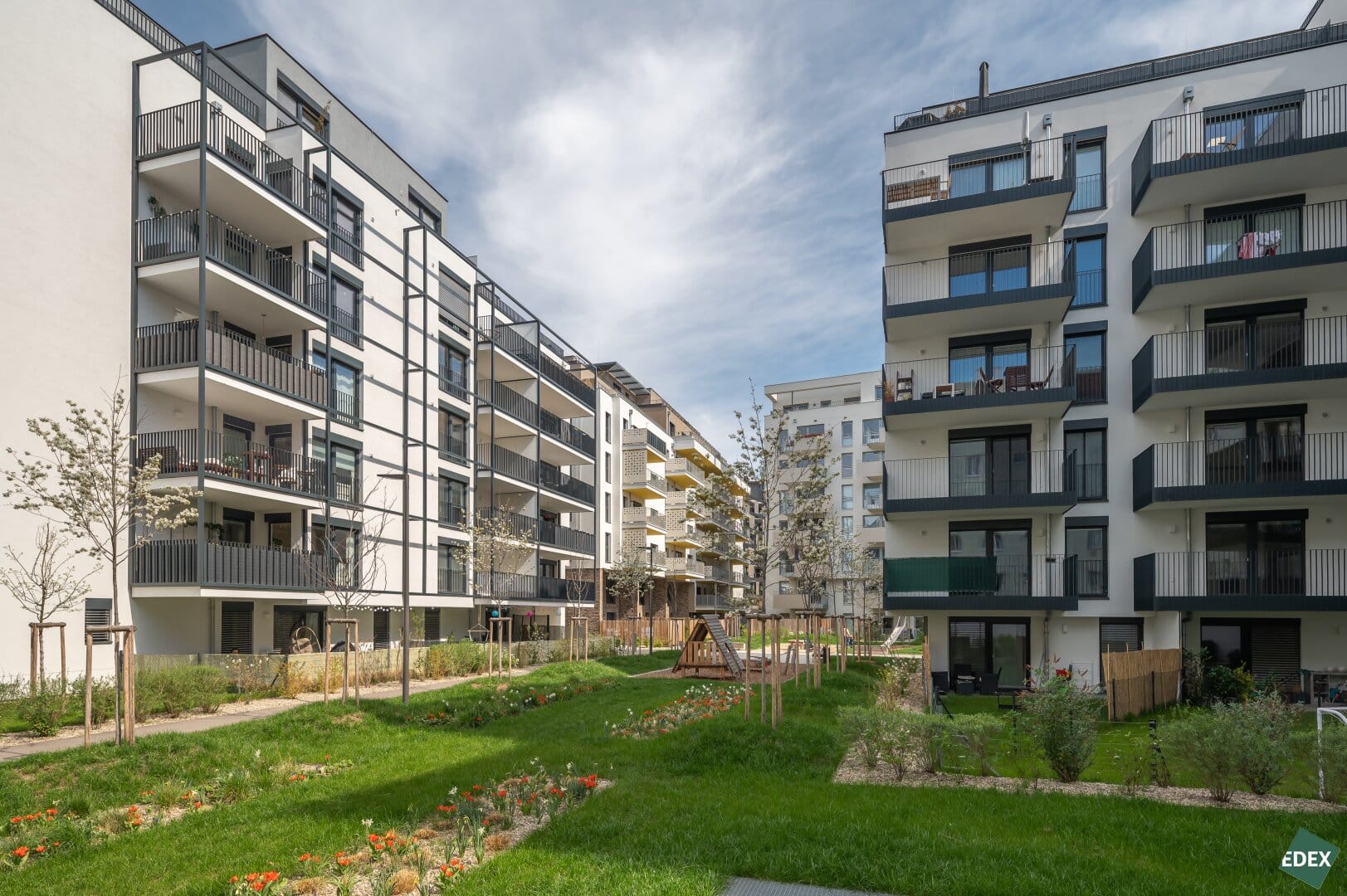 Alle Wohnungen von IU bieten sowohl Geborgenheit als auch Inspiration. Die intelligente Raumnutzung vermittelt selbst bei kleineren Flächen Großzügigkeit. Gänge werden durch Verteilerräume ersetzt. Im Zentrum der meisten Einheiten steht eine einladende Wohn-Essküche. Offenheit nach außen verstärkt das Gefühl, frei zu sein: Alle Wohnungen sind lichtdurchflutet und haben einen Balkon, eine Loggia, eine Terrasse oder einen eigenen Garten. Die hochwertige Ausstattung umfasst zum Beispiel Parkettböden, 3-fach-Verglasungen, elegante Bäder und Einbauküchen sowie eine Fernwärme-Fußbodenheizung. Außerhalb der eigenen vier Wände stehen eine Tiefgarage, Fahrradräume, Paketboxen und natürlich die Parklandschaft zur Verfügung. Spielplätze, Relax-Bereiche und Wasserflächen inklusive.