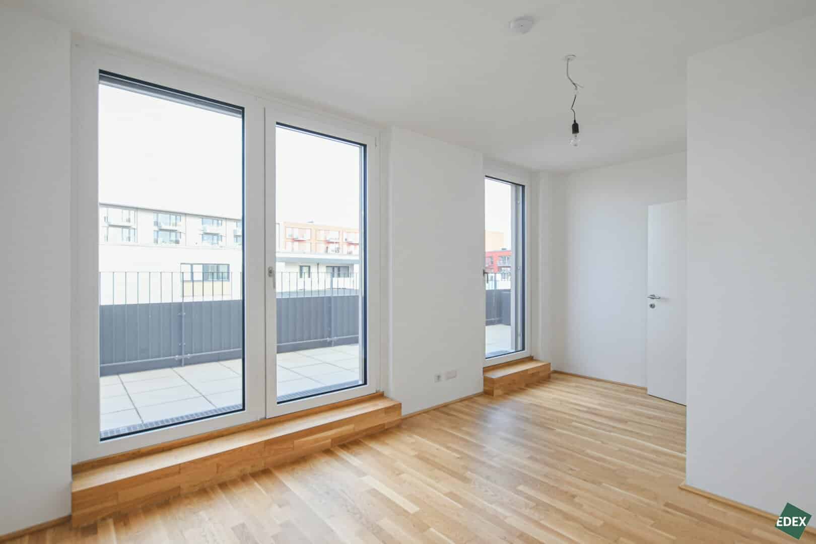 Zur Vermietung gelangt eine 3-Zimmer Wohnung in idyllischer und urbaner Atmosphäre. Die lichtdurchflutete Wohnung verfügt über einen Vorraum, einen Abstellraum, ein kleines Badezimmer mit Toilette und Dusche, ein Badezimmer mit Badewanne, Dusche, WC und Waschmaschinenanschluss, einen großzügigen Wohnbereich (+40 m²) mit einer modernen, offenen Küche und Zugang zu einer ca. 144 m² großen Terrasse sowie über zwei Schlafzimmer mit ebenfalls Zugang Terrasse. Die 3-fach-verglasten Fenster sind mit einem hochwertigen Sonnenschutz ausgestattet. Die Wohnräume sind mit schönem Parkettboden ausgestattet und die Nassräume mit Fliesen verlegt. Weiters verfügt die Wohnung über ein Kellerabteil. Im Haus befinden sich Kinderwagen- und Fahrradabstellräume sowie Paketboxen.