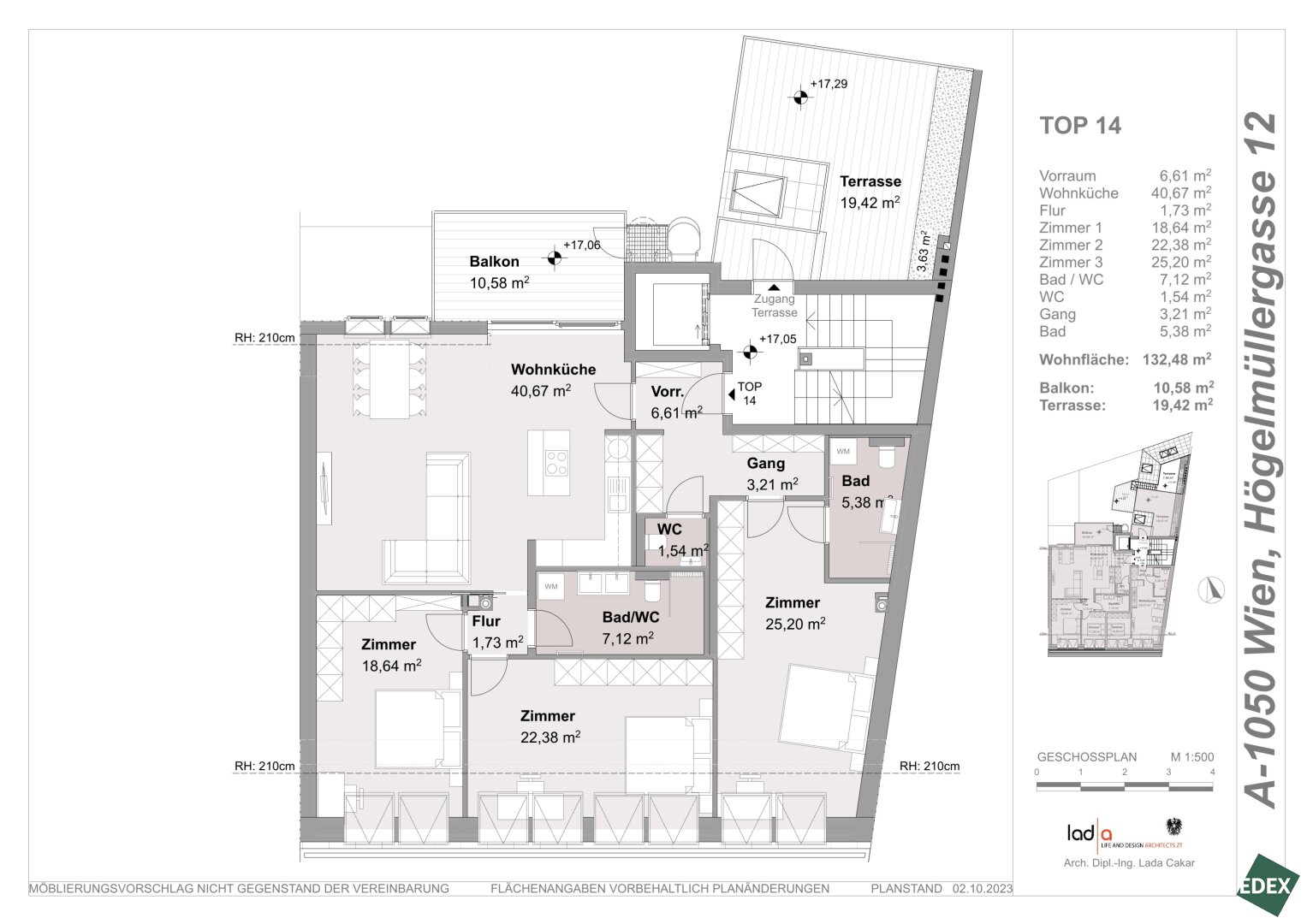 • TOP 14a: ca. 44,33 m² große 2-Zimmerwohnung mit ca. 19,42 m² Terrasse: EUR 398.000,-