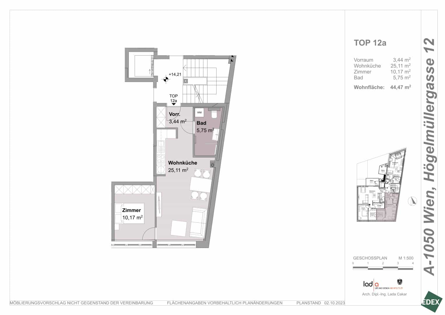 - TOP 14a: ca. 44,33 m² große 2-Zimmerwohnung mit ca. 19,42 m² Terrasse: EUR 398.000,-