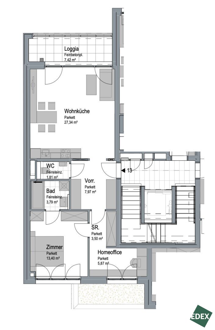 - TOP 13: ca. 63,68 m² 2-Zimmer-Wohnung mit 7,42 m² Loggia