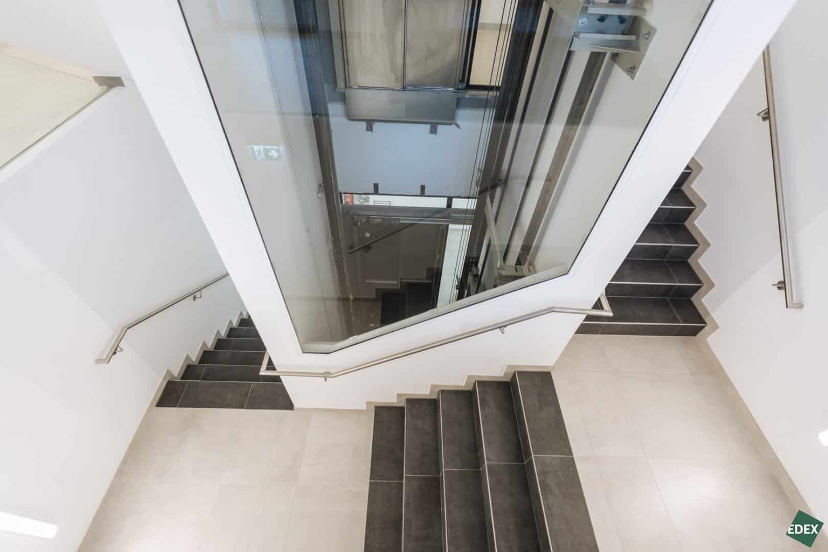 • Aufzug mit einem teilweise verglasten Schacht, Aufzugskabine in Edelstahl mit raumhohem Spiegel und LED-Leuchtpaneeldecke