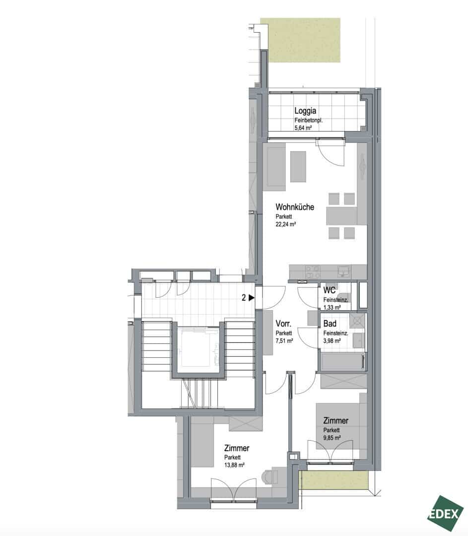 • TOP 2: ca. 58,79 m² 3-Zimmer-Wohnung mit 5,64 m² Loggia