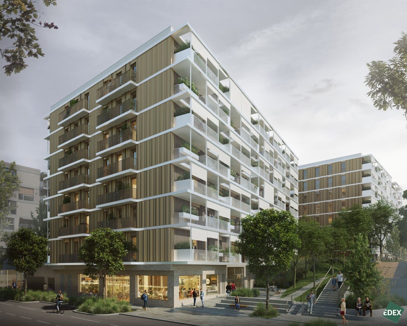 Großzügig und freundlich gestaltete Entrées empfangen die Bewohner:innen und leiten in geräumige Stiegenhäuser. Einschnitte in den obersten Geschossen und weite Treppenaugen bringen Tageslicht tief in die Allgemeinbereiche. Einen wichtigen Beitrag zum sommerlichen Hitzeschutz leisten begrünte Freiraumzonen vor den Wohnungen sowie der textile Sonnenschutz an den Balkonfronten. Auf den Gründächern entsteht mit einem Biodiversitätskonzept neuer Lebensraum für Vögel und Insekten.